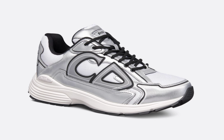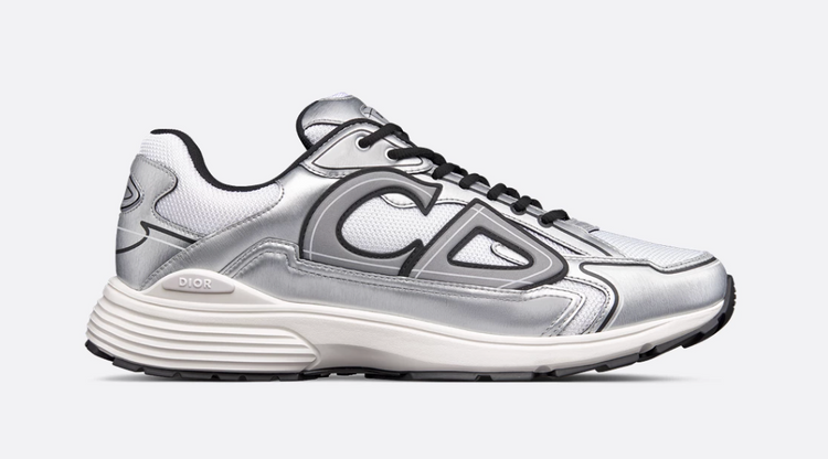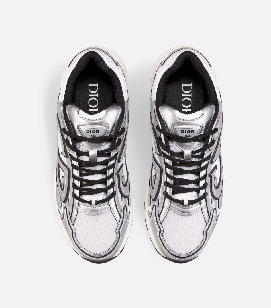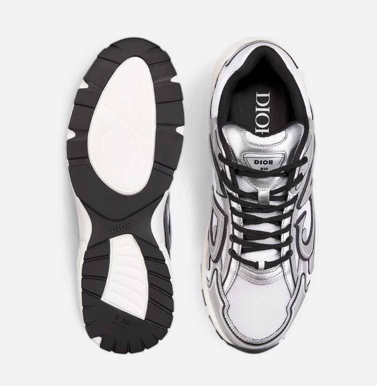 The B30 Countdown low-top sneaker, a new must-have for the brand, showcases a stylish, sporty silhouette. Crafted from grey technical mesh and accented with light blue, blue, and grey technical fabric, it features a reflective CD30 logo for a graphic appeal. Silver Dior B30 and CD30 signatures are embellished on the tongue and back. The ultra-lightweight, sculpted rubber sole is accented with classic details, while the elastic inner lining provides exceptional comfort, perfect for any casual look.