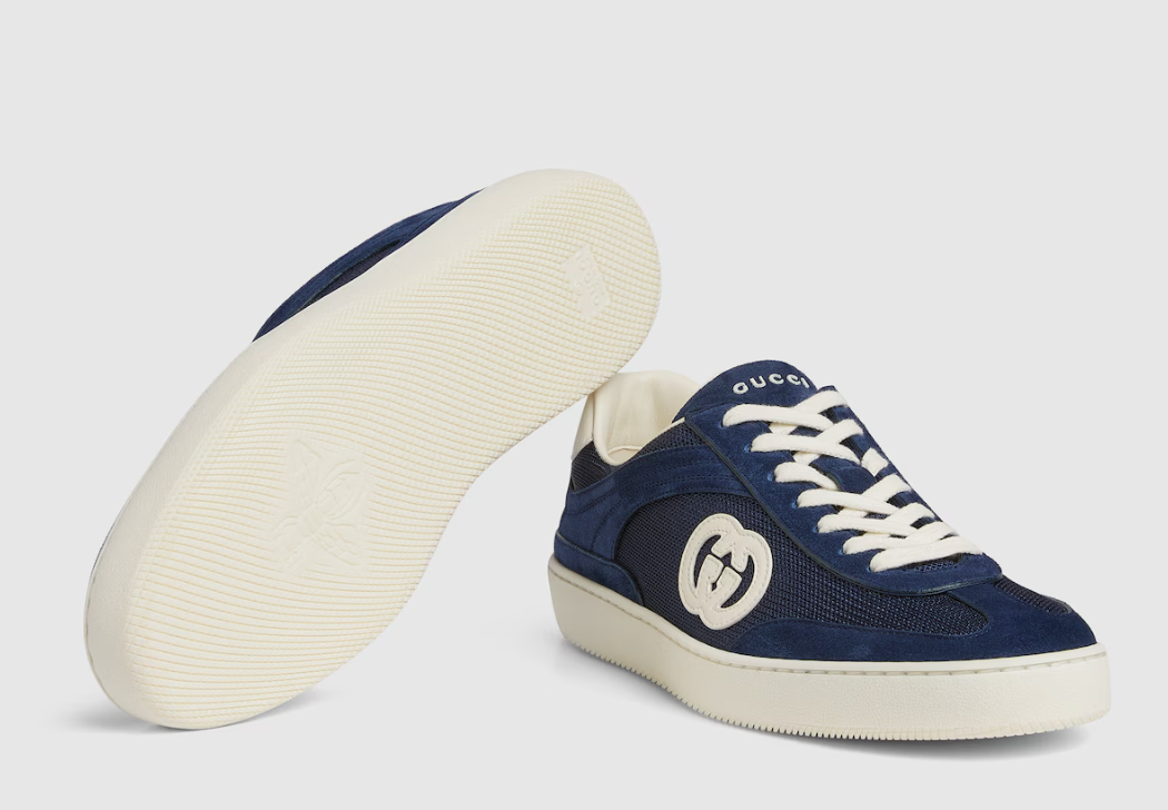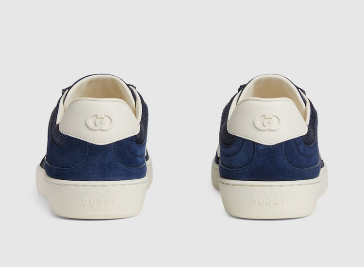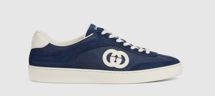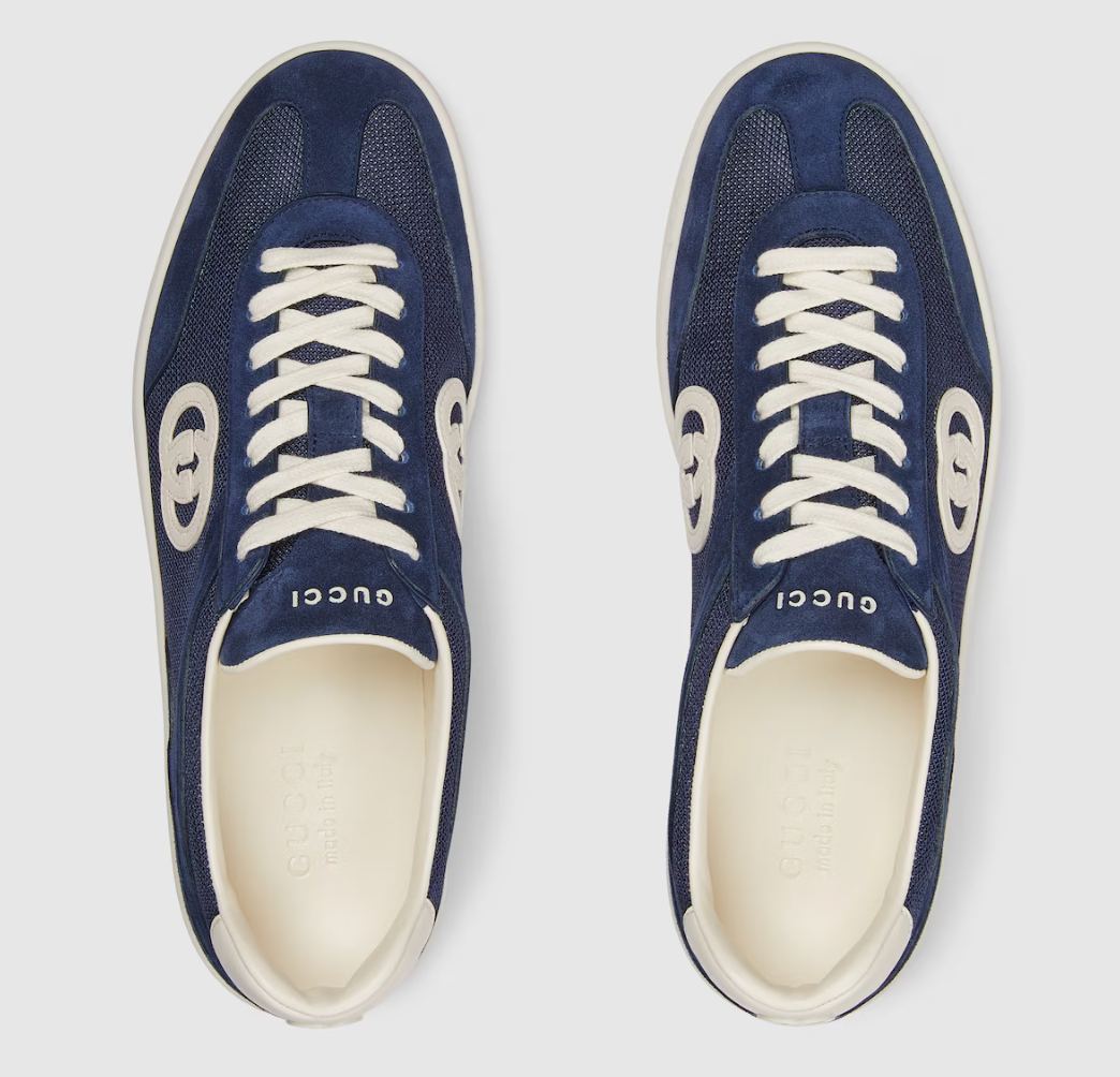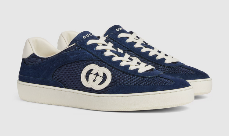 Crafted in suede, this pair of men's sneakers is defined by signature Gucci symbols such as the Interlocking G logo. Insert detail in GG canvas enhances the sneaker's style, casual yet unique.