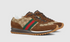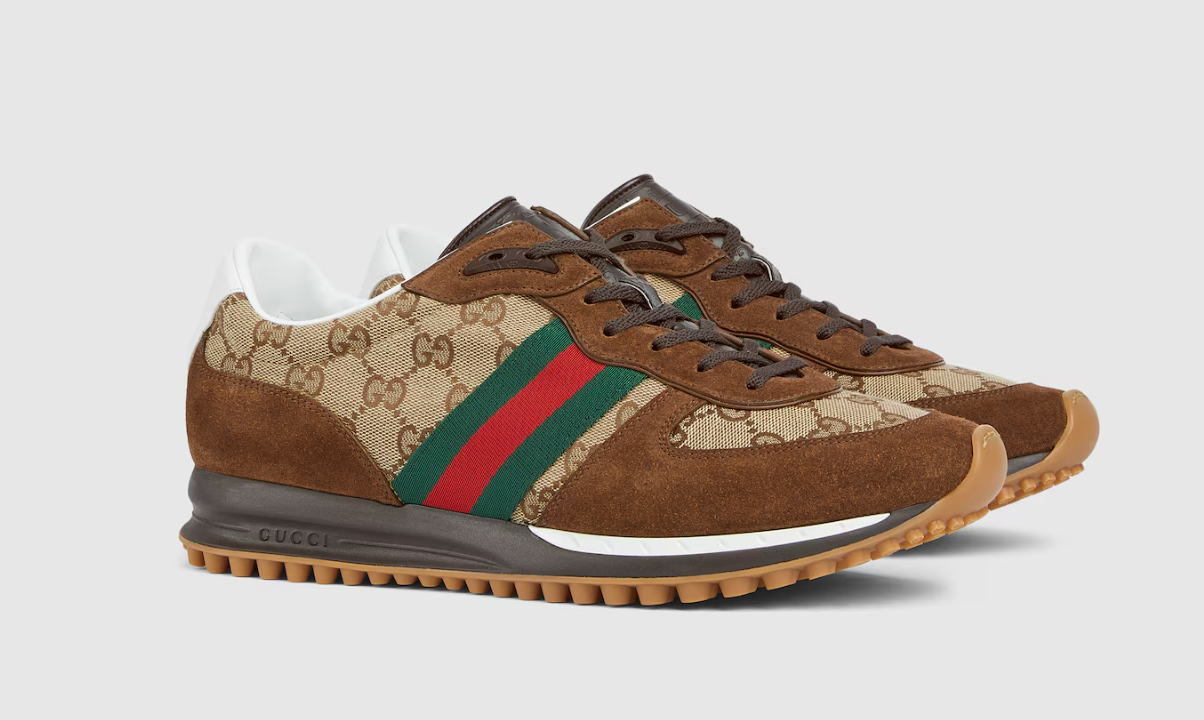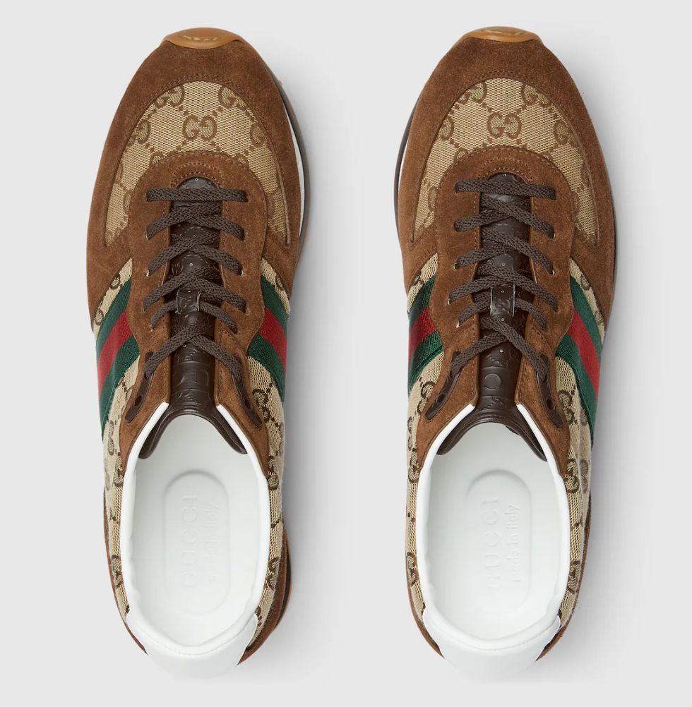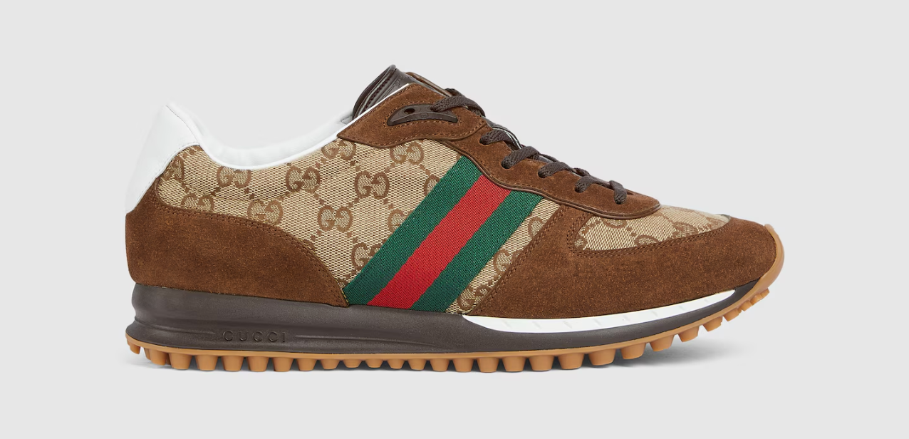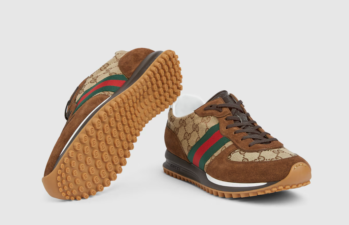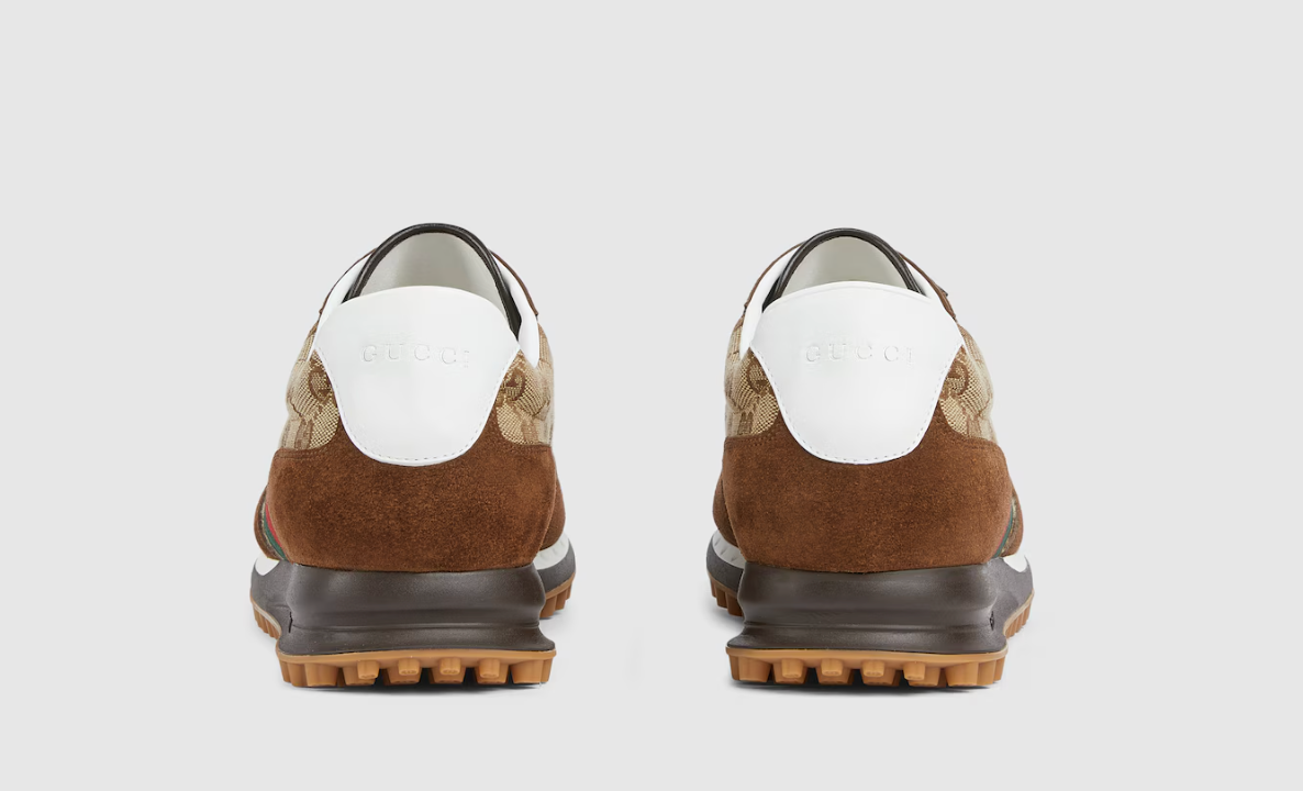 In the Fall Winter 2025 collection, the Gucci Re-Motion sneaker blends classic with contemporary elements. Crafted from GG canvas, the model is completed with the signature green and red Web. The lightweight, flexible outsole has gone through a special treatment to create a retro appeal.