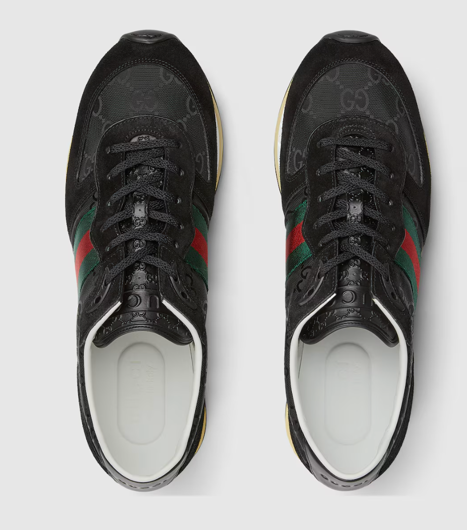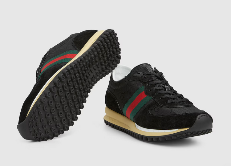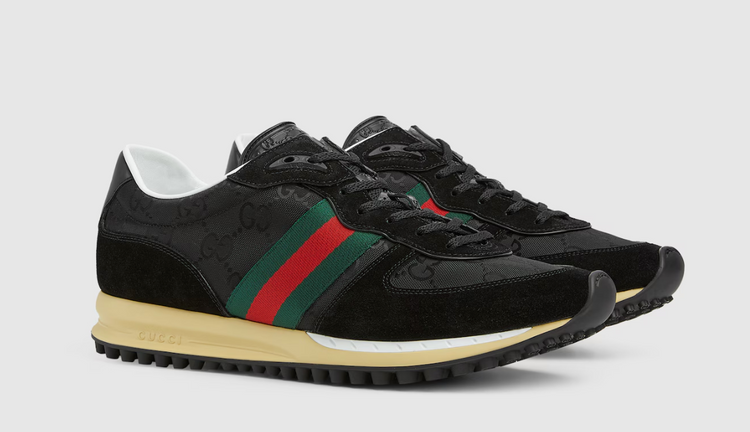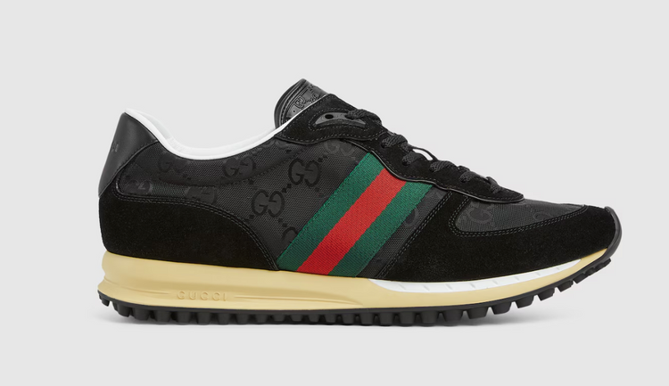 In the Fall Winter 2025 collection, the Gucci Re-Motion sneaker blends classic with contemporary elements. Crafted from GG canvas, the model is completed with the signature green and red Web. The lightweight, flexible outsole has gone through a special treatment to create a retro appeal.