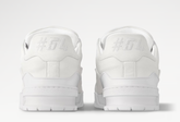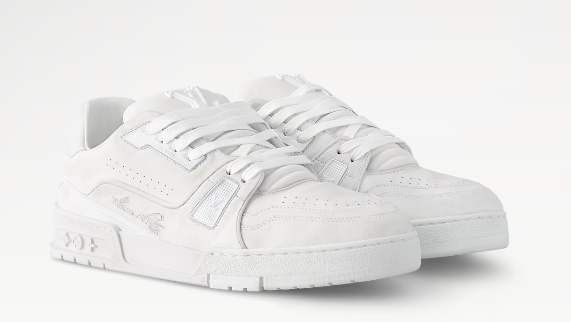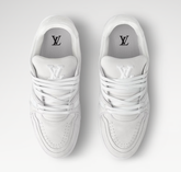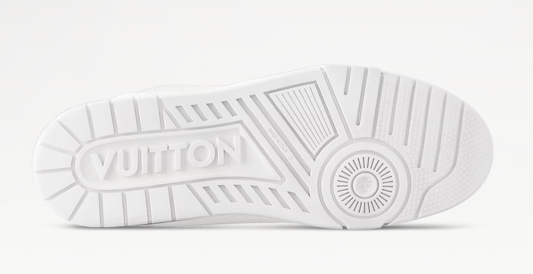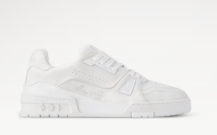 The LV Trainer sneaker is reinterpreted in smooth calf leather with a distinctive vintage effect . The elaborately constructed upper offers unique suppleness and features rubber detailing and the Louis Vuitton script signature on the side. The very flexible rubber outsole which provides extra comfort, is decorated with Monogram Flowers, and is matched to the upper for a smart look.