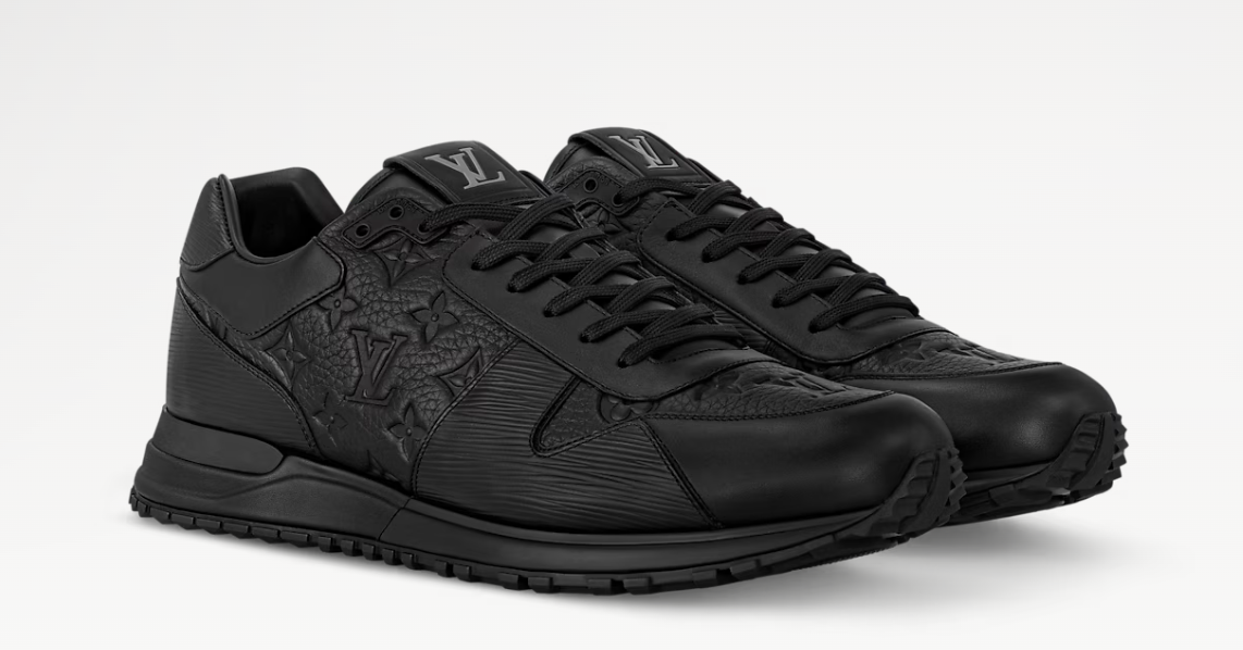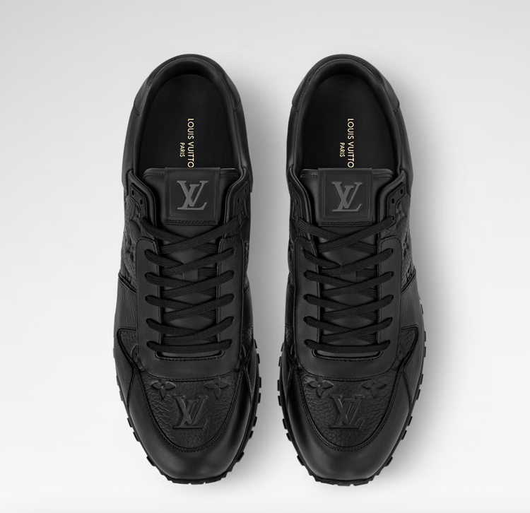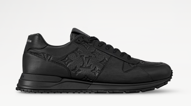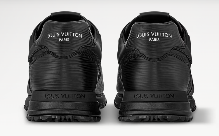 This edition of the Run Away sneaker combines two emblematic leathers: Monogram-embossed grained calf and Epi calf leather. The wedge-shaped rubber outsole, which was inspired by running shoes, is color-matched to the upper for a monochrome look. This model features an LV Initials logo on the tongue and a Louis Vuitton Paris signature on the back.