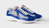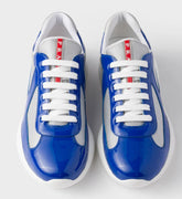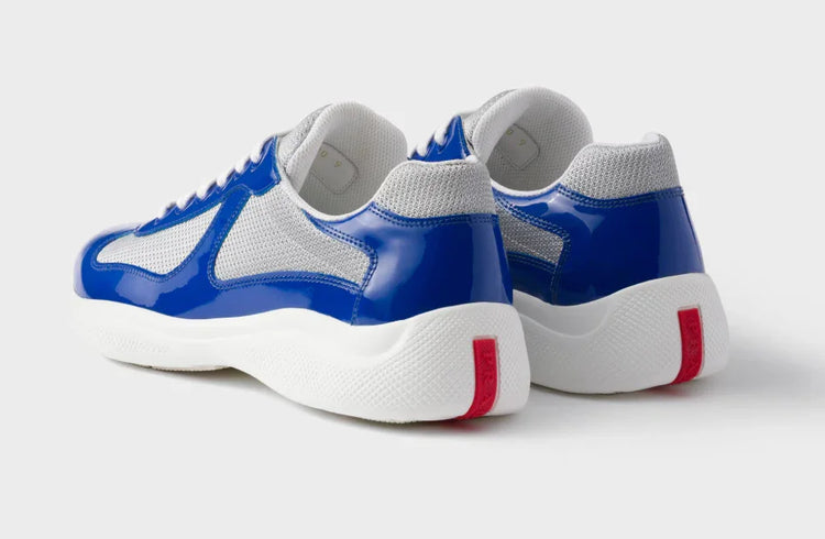 These patent leather sneakers with bike fabric inserts are inspired by an iconic aesthetic. The unmistakable Prada Linea Rossa logo on the tongue and sole enhances the design.