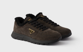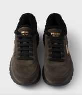 Prax sneakers combine style and comfort in one sporty design, defined by refined materials and details. The suede shoe with a soft shearling lining is decorated with the iconic enameled metal triangle logo.