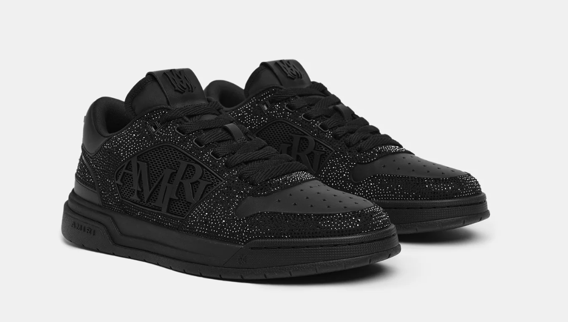 Autumn-Winter 2025 presents the house's interpretation of the timeless tennis sneaker in new seasonal colors and fabrications. The Classic Low is crafted on a rubber sole with a leather and denim upper, textured laces, and central panels of molded rubber mesh framing the AMIRI staggered logo.