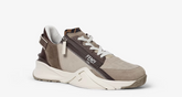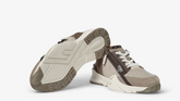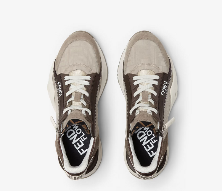 Slip-on trainers with elasticated laces, side zip and corrugated soles with engraved F. Fendi Flow lettering embossed on the heels. Made from beige nubuck leather with hot stamped FF motif and khaki suede details. Embellished with a Lycra® tongue with FF motif. Sole in lightweight white rubber with diagonal F detail.