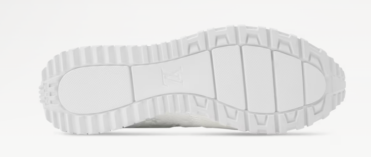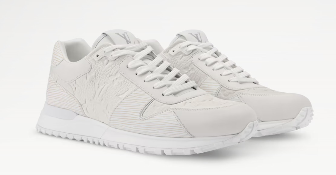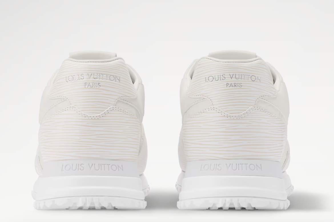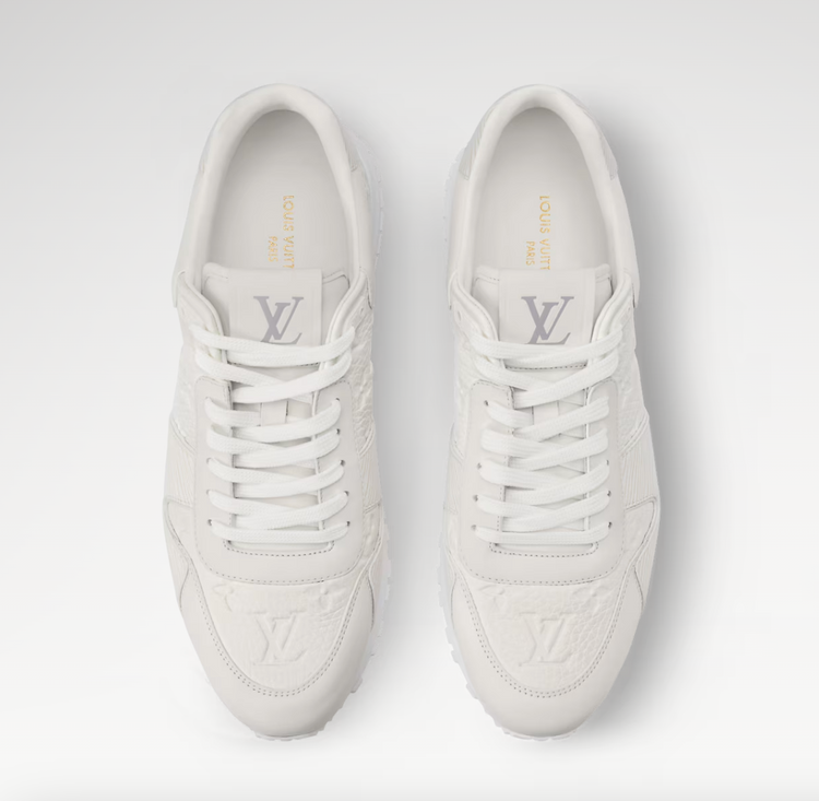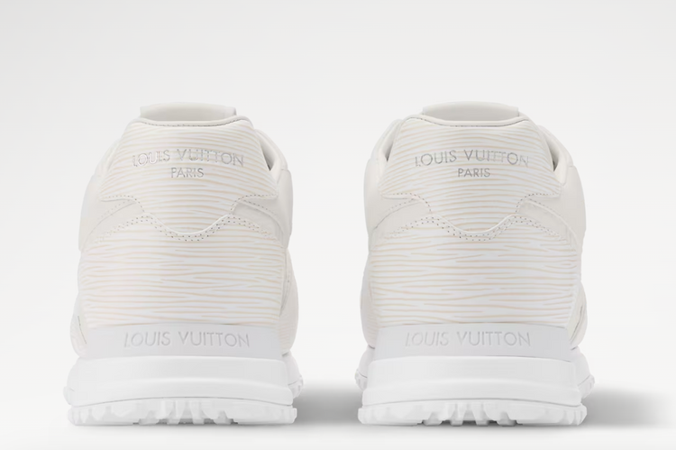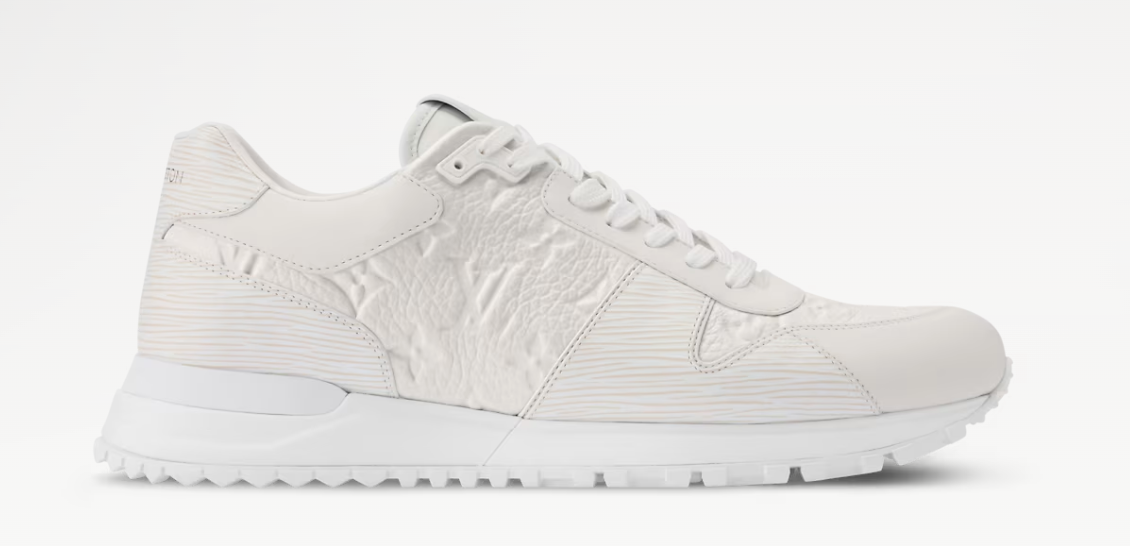 This edition of the Run Away sneaker combines two emblematic leathers: Monogram-embossed grained calf and Epi calf leather. The wedge-shaped rubber outsole, which was inspired by running shoes, is color-matched to the upper for a monochrome look. This model features an LV Initials logo on the tongue and a Louis Vuitton Paris signature on the back.
