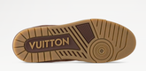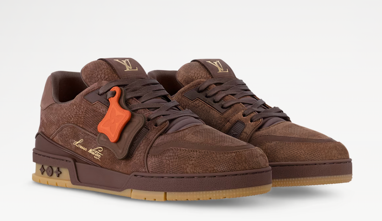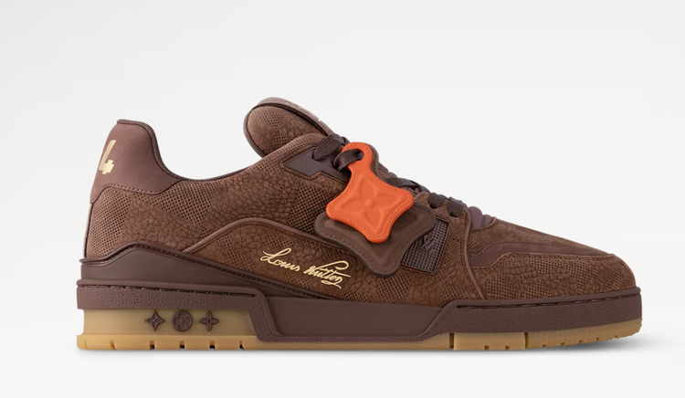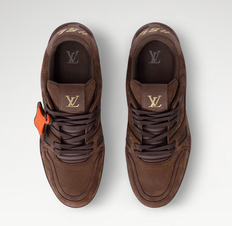 The LV Trainers are reinterpreted in nubuck calf leather embossed with the Damier pattern. This cult design, which references vintage basketball trainers, is notable for its many signature details. These include removable Monogram Flower tags on the laces and the #54 signature on the back, referring to 1854, when the House was founded.