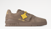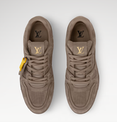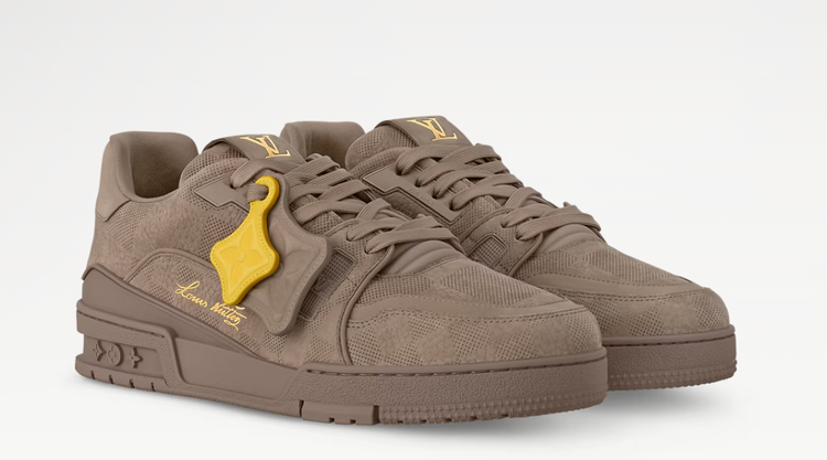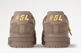 The LV Trainers are reinterpreted in nubuck calf leather embossed with the Damier pattern. This cult design, which references vintage basketball trainers, is notable for its many signature details. These include removable Monogram Flower tags on the laces and the #54 signature on the back, referring to 1854, when the House was founded.