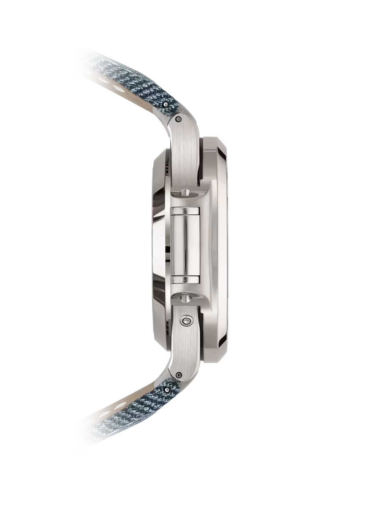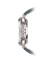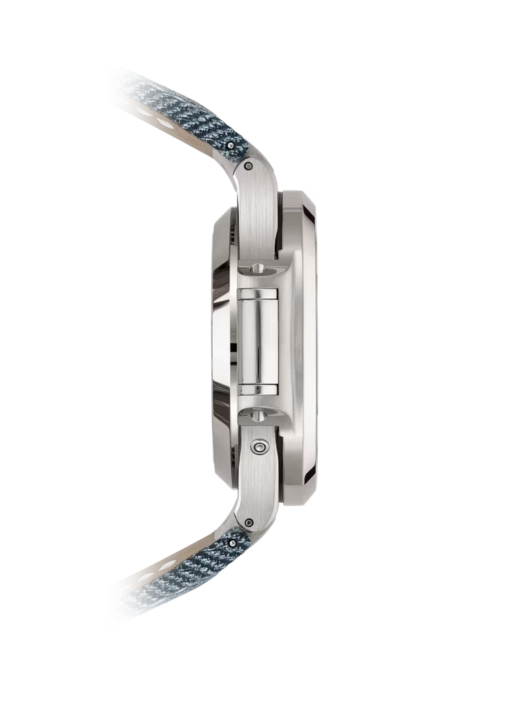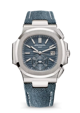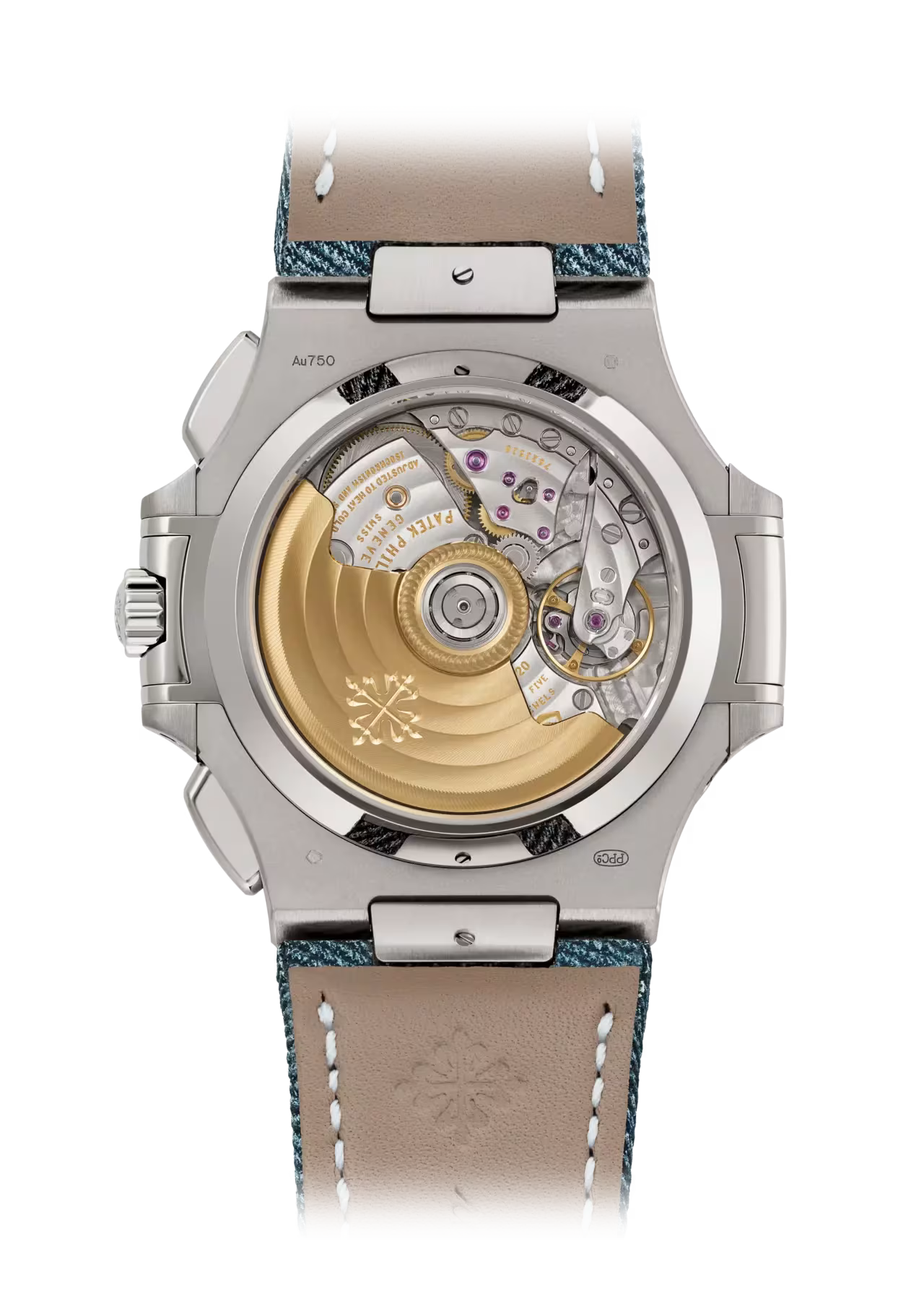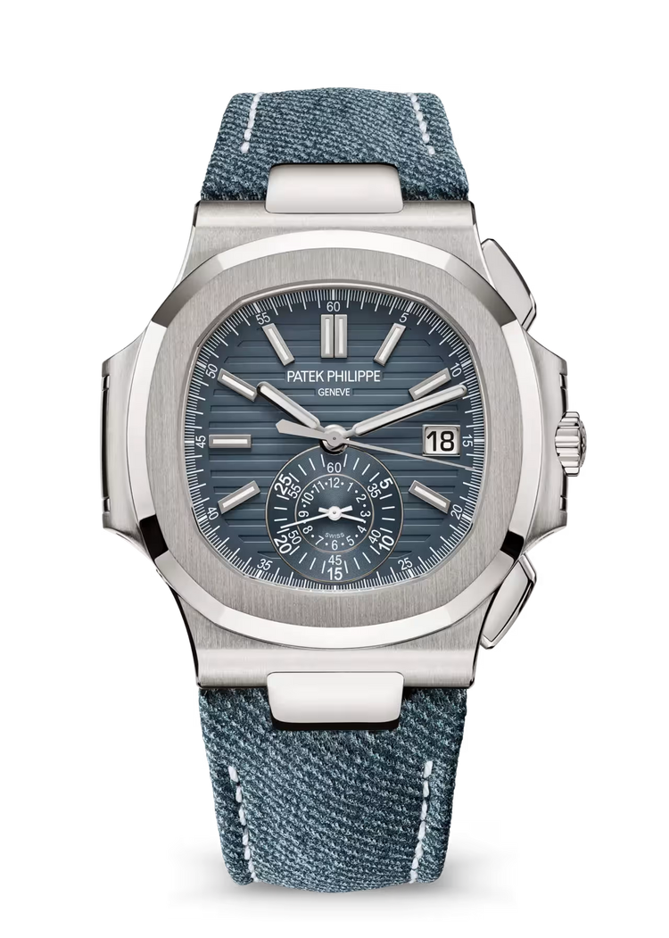 Calfskin, denim pattern, hand-stitched, blue (originally fitted). Composite material, fabric pattern, blue-gray (additional strap). White gold fold-over clasp.