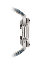 Opaline blue-gray, horizontally embossed, white gold applied baton-style hour markers with white luminescent coating. White gold rounded baton-style hands with white luminescent coating.