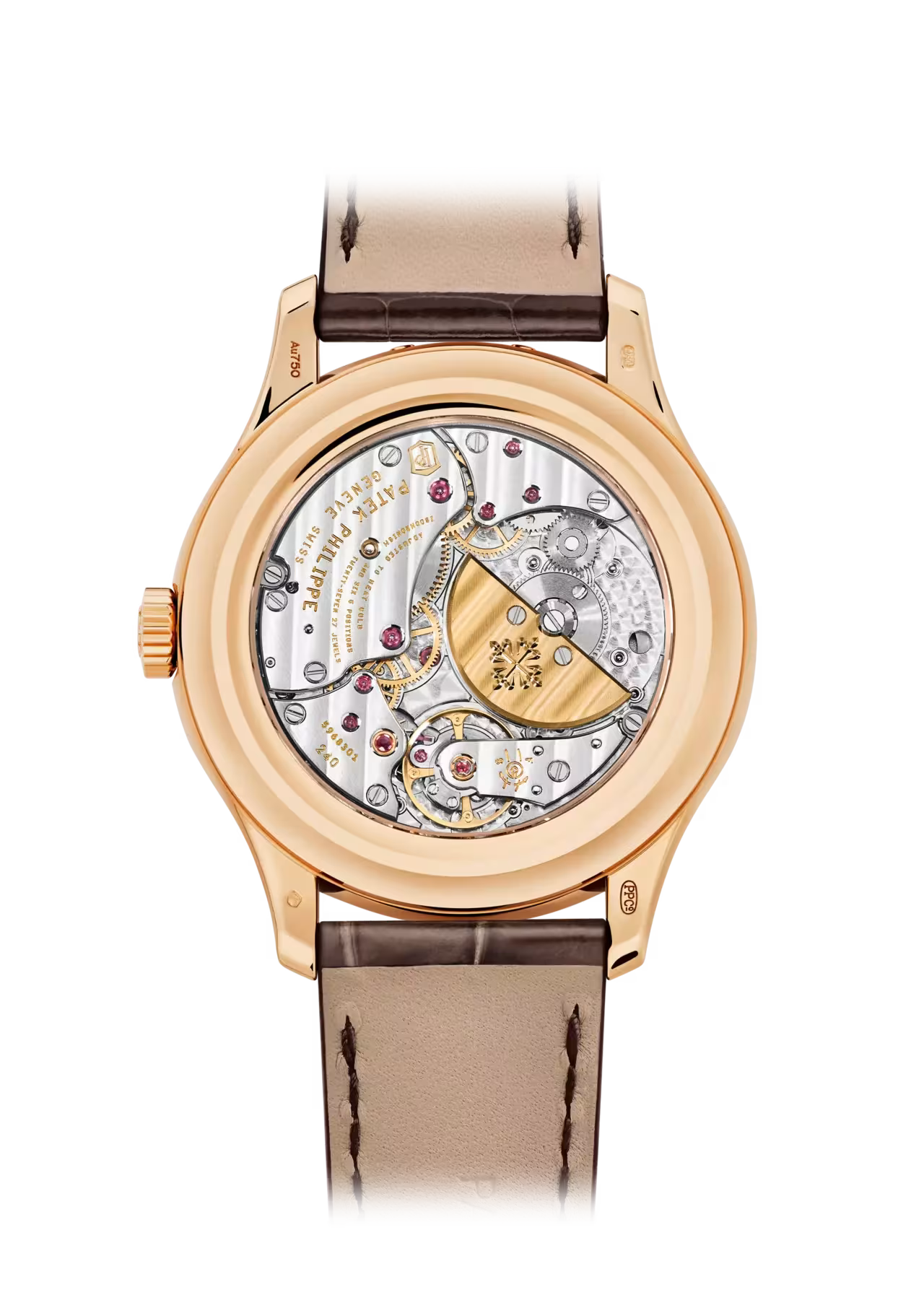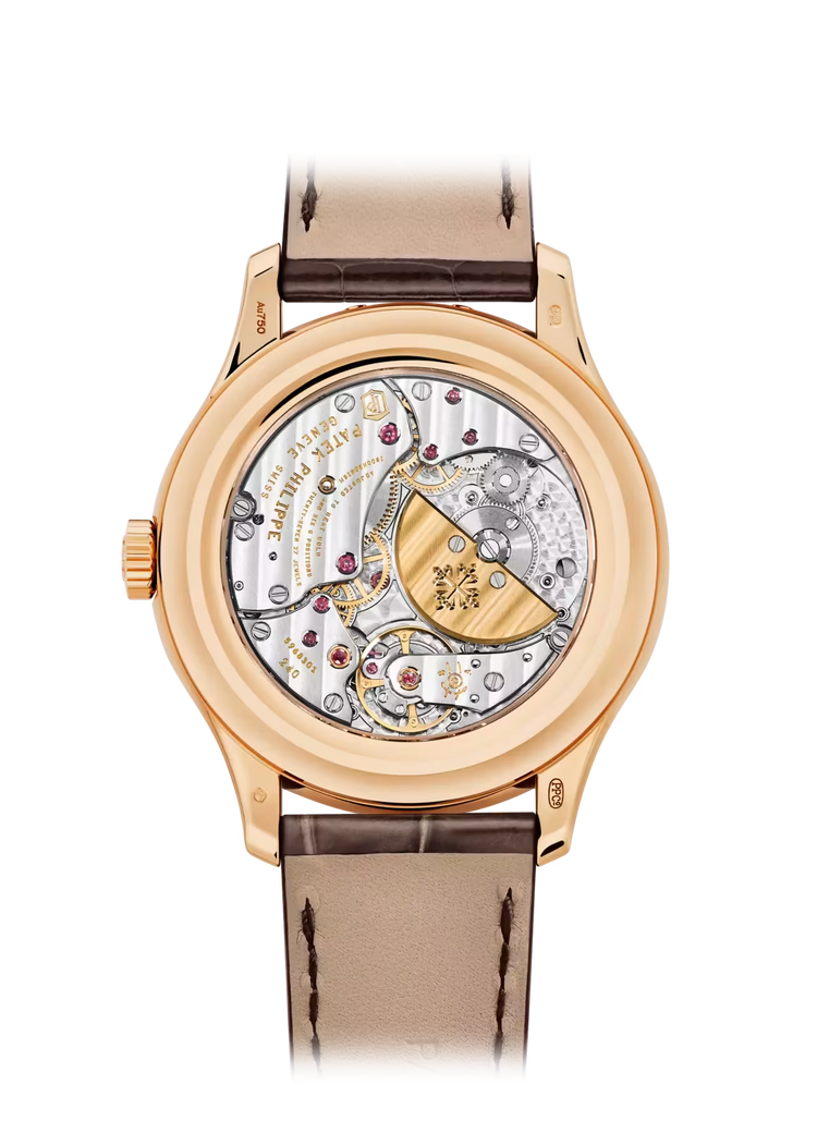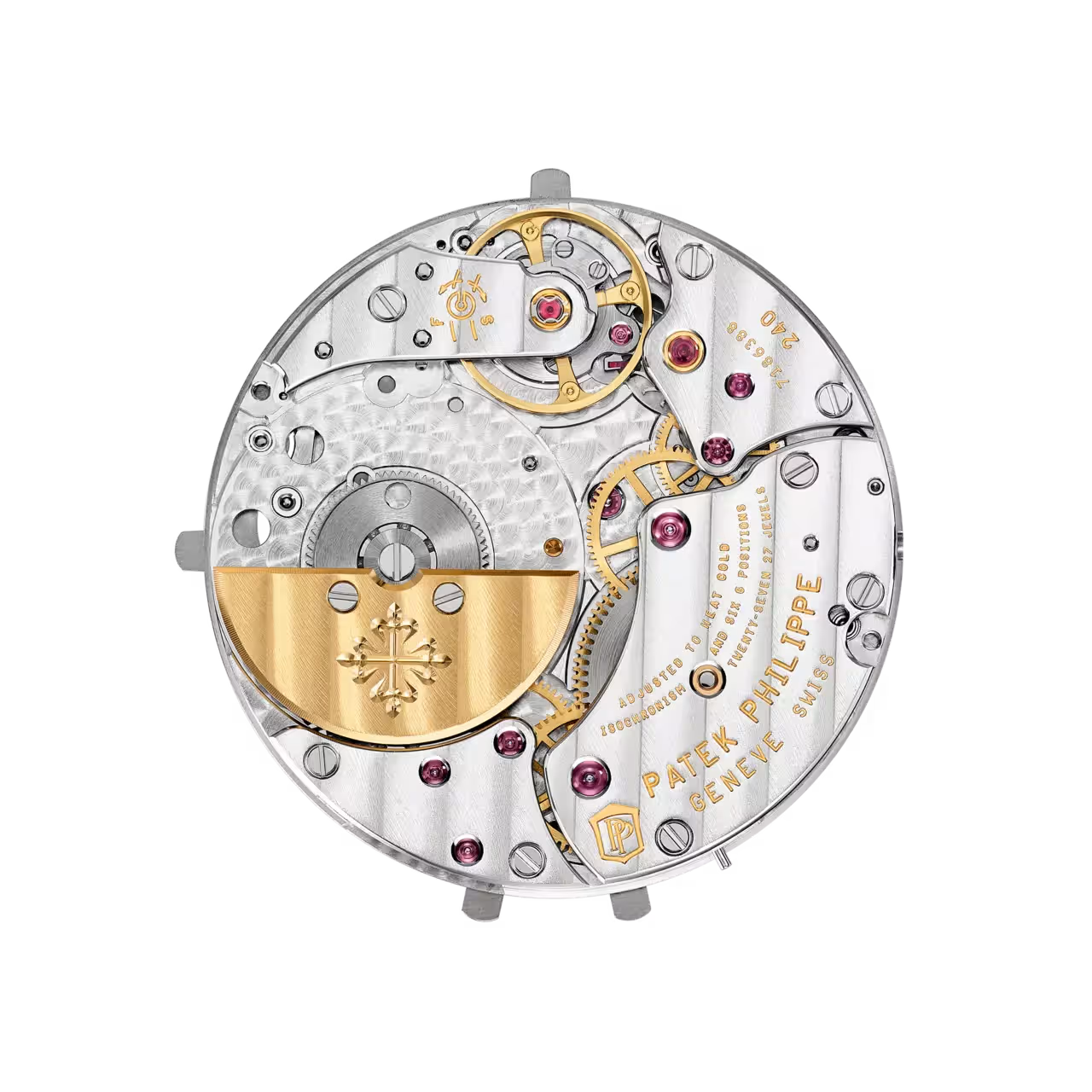 Diameter: 27.5 mm. Thickness: 3.88 mm. Number of parts: 275. Number of jewels: 27. Power reserve: min. 38 hours – max. 48 hours. Winding rotor: 22K gold off-center minirotor. Gyromax®. Frequency: 21,600 semi-oscillations/hour (3 Hz). Balance spring: Spiromax®. Distinctive sign: Patek Philippe Seal.