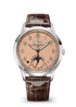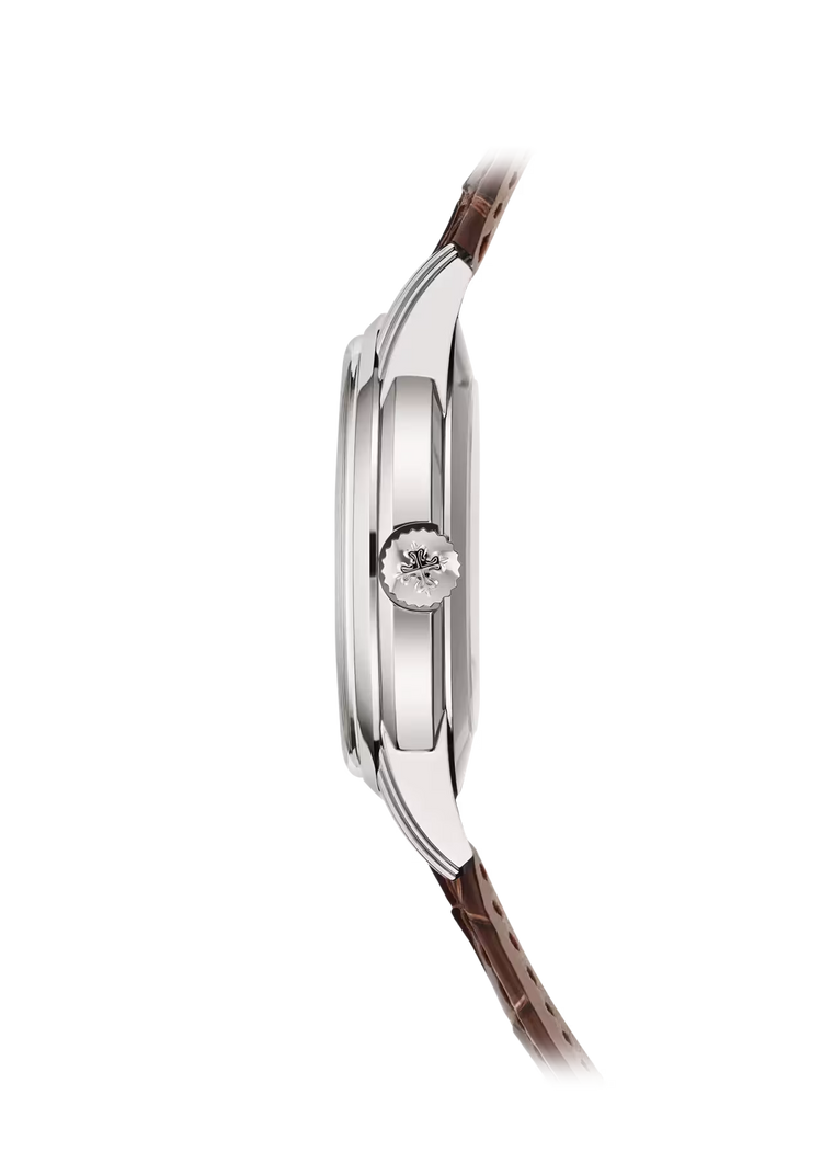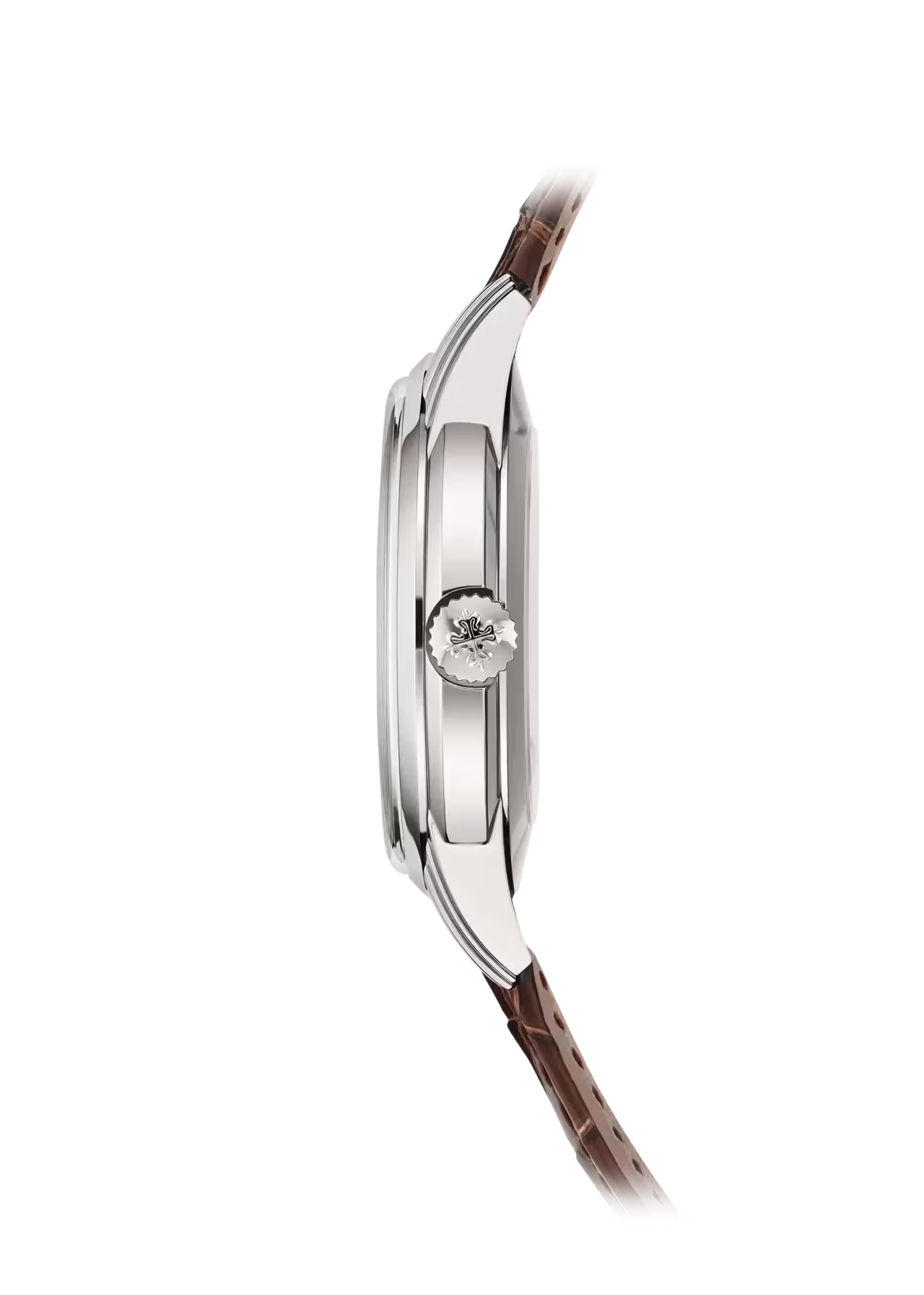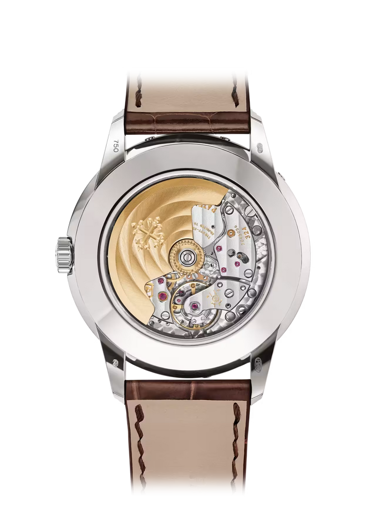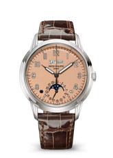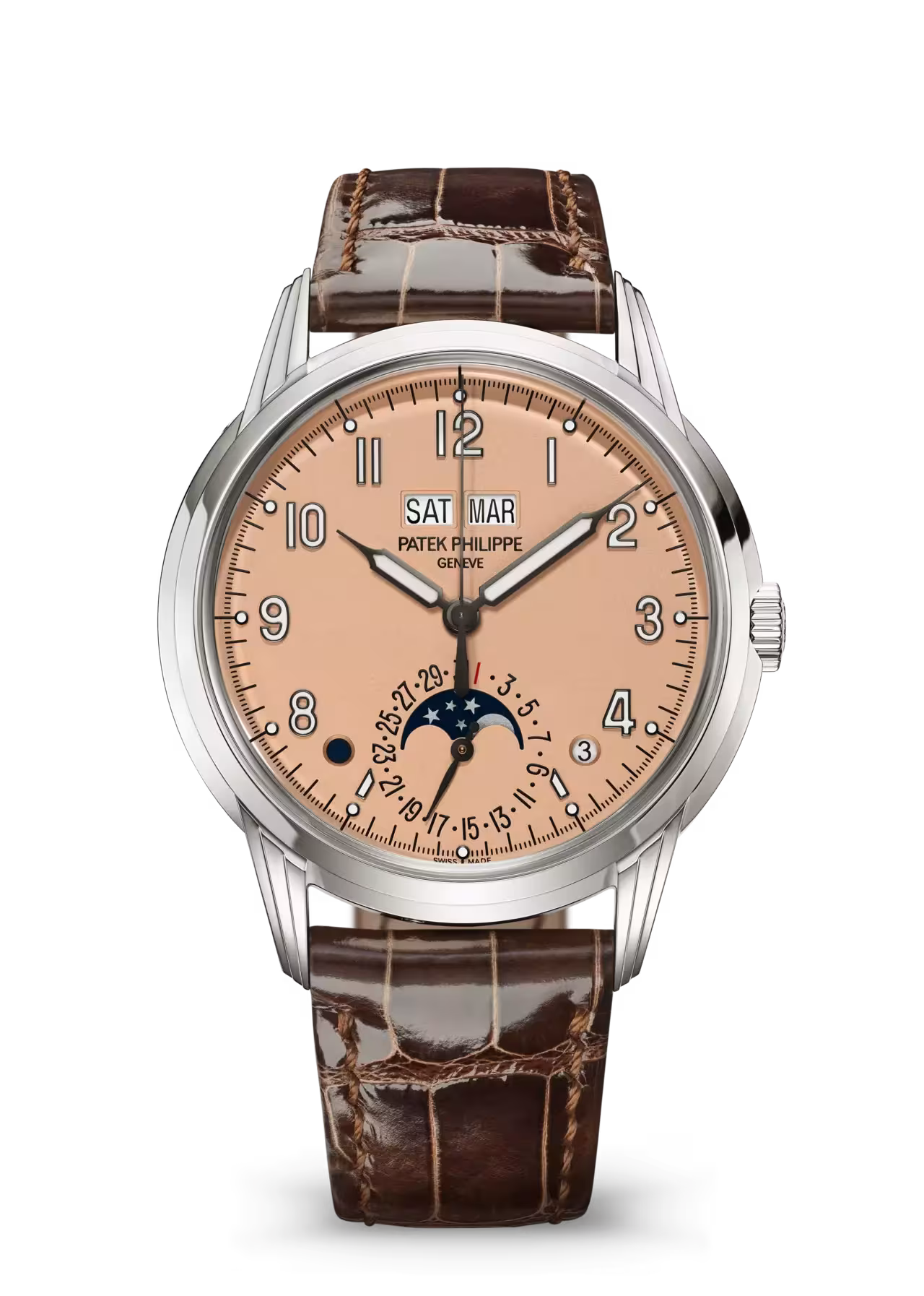 The epitome of balance and legibility, this perpetual calendar pairs a white gold case with three-tier lugs and a rose-gilt opaline dial. The displays feature one of Patek Philippe's signature perpetual calendar layouts, with an in-line double day/month aperture at 12 o'clock and a date displayed by hand surrounding the moon-phase aperture at 6 o'clock.