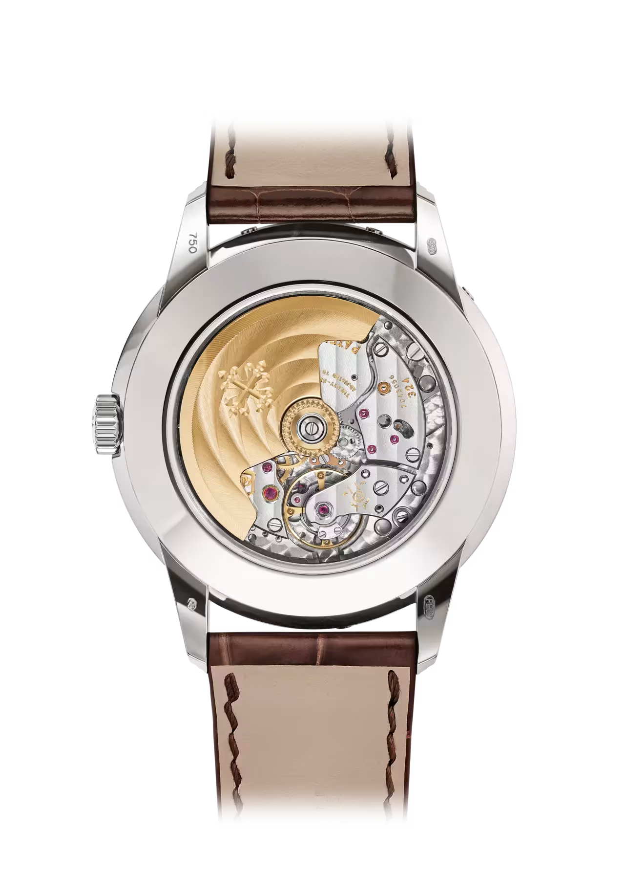 Diameter: 32 mm. Thickness: 4.97 mm. Number of parts: 368. Number of jewels: 29. Power reserve: min. 35 hours – max. 45 hours. Winding rotor: 21K gold central rotor. Gyromax®. Frequency: 28,800 semi-oscillations/hour (4 Hz). Balance spring: Spiromax®. Distinctive sign: Patek Philippe Seal.